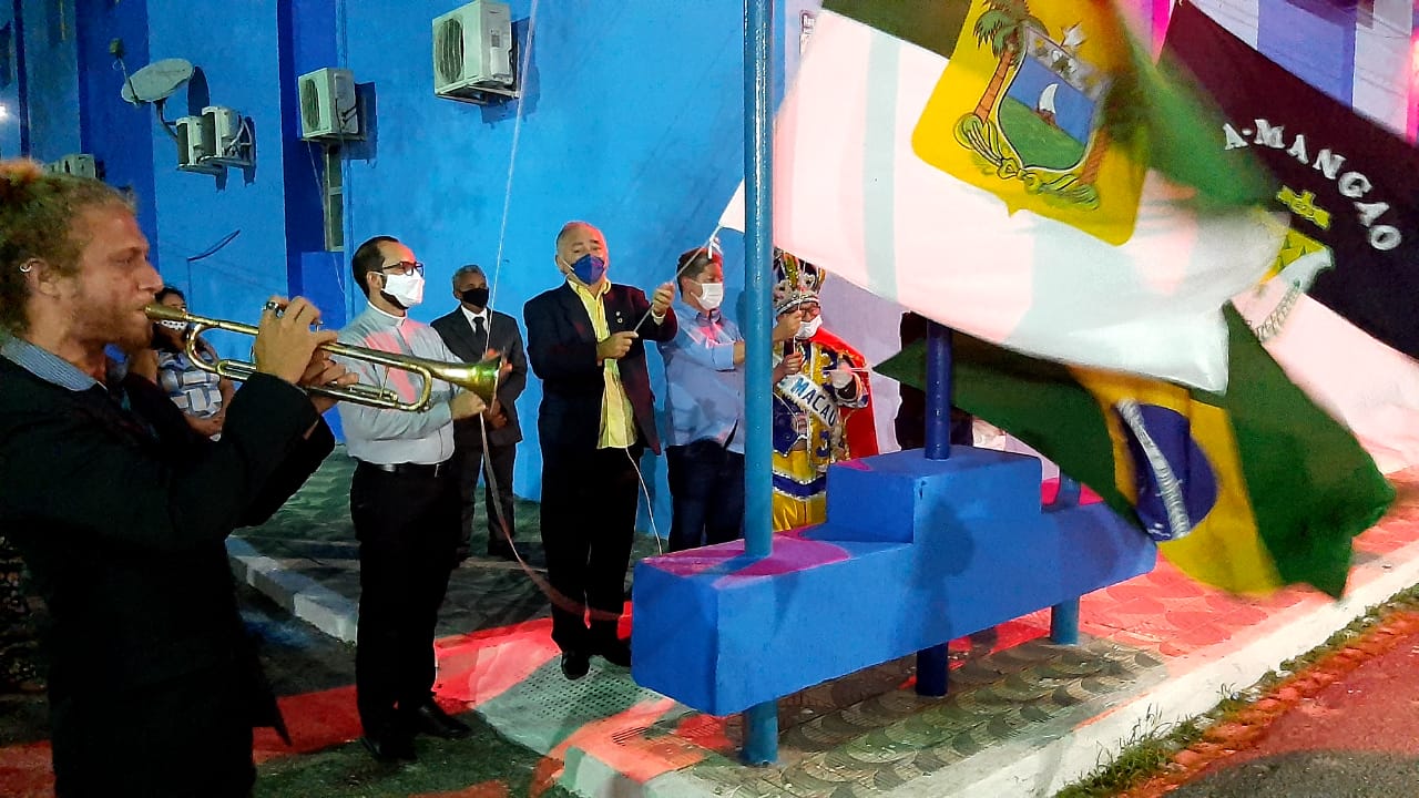 Após a missa, o prefeito Túlio Lemos, vereador Oscar Paulino, padre Gilson, secretário Aluízio Viana, comandante Benício e “rei dos idosos” Pedro descerraram as bandeiras, em frente ao Palácio João Melo, sede do Executivo Municipal.