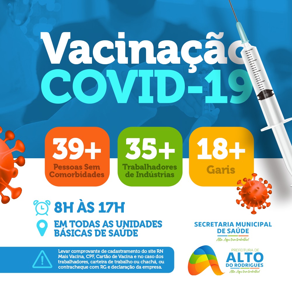 A Prefeitura Municipal de Alto do Rodrigues, através da secretaria de Saúde, segue com a campanha nacional de imunização contra a Covid-19 no município.