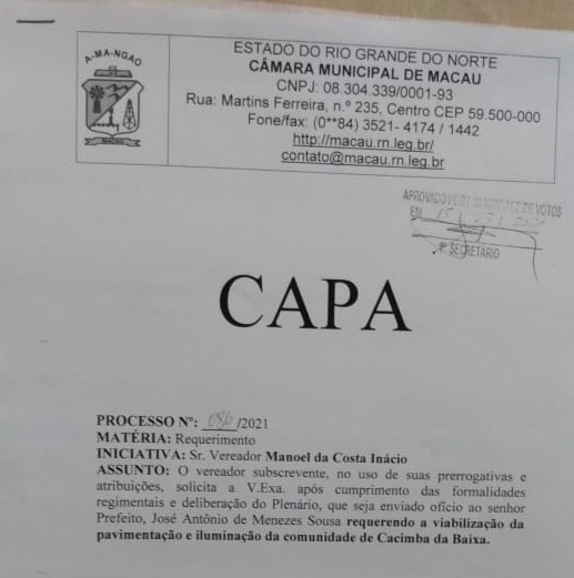 CAMARA DE MACAU – VEREADOR BAÊGA APRESENTA REQUERIMENTO NA CAMARA MUNICIPAL