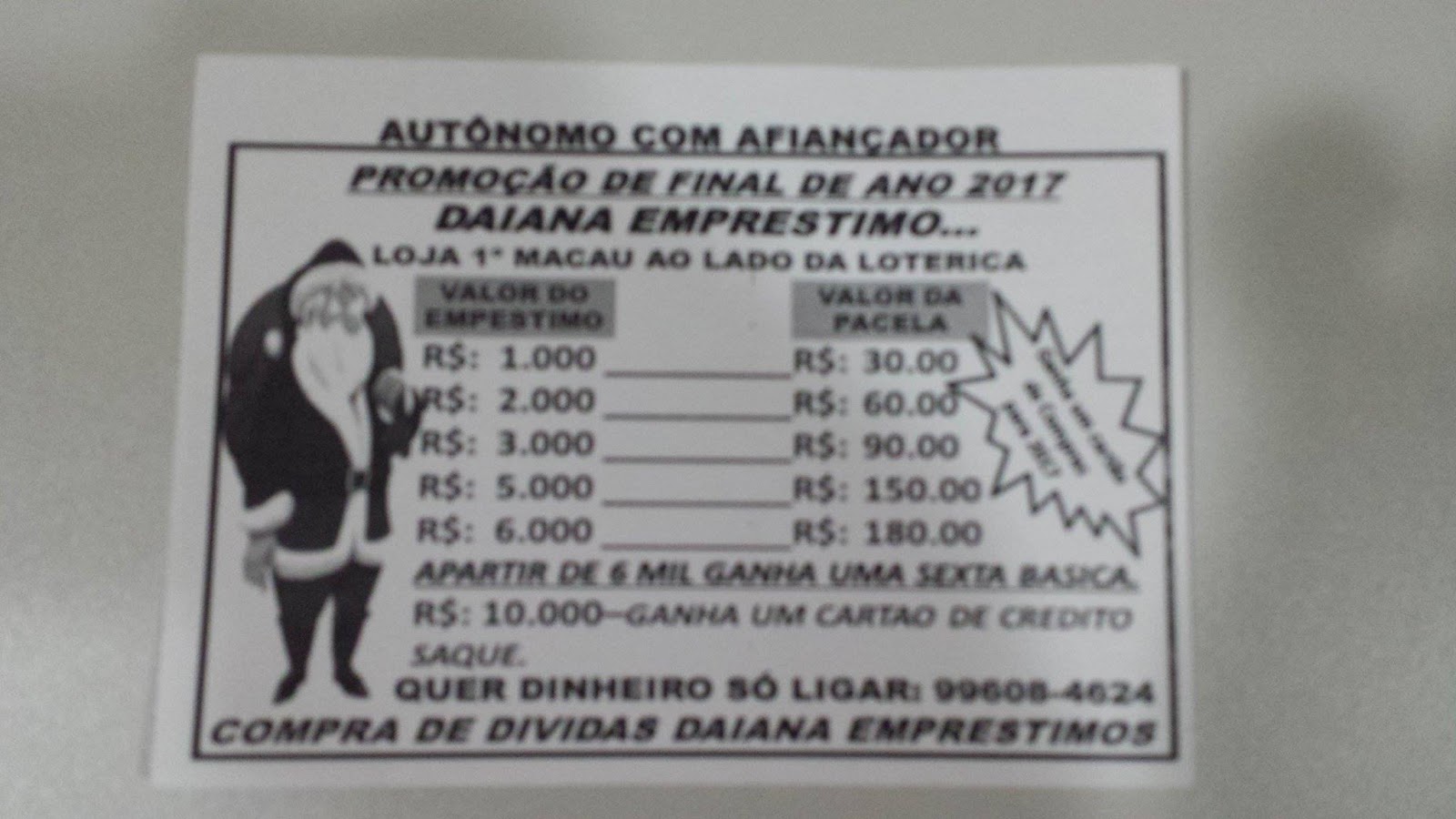 10 dezembro de 2016 DAIANA EMPRÉSTIMOS – QUER DINHEIRO? É SÓ LIGAR Compramos sua divida, venha nos fazer uma visita – Loja 1 ao lado da lotérica. FONE: 9 9608 4624