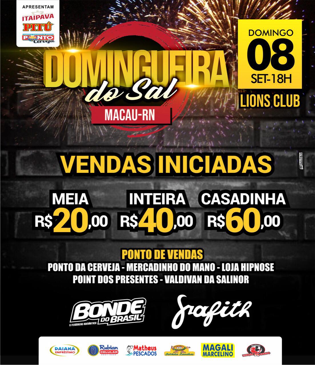 Com banda grafith e bonde do Brasil, 08 de setembro uma grande noite com grandes atrações no Lions CLube de Macau.