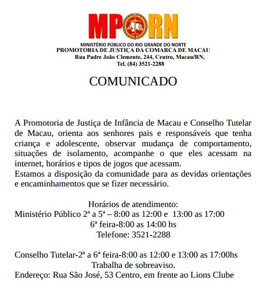 O polêmico ‘Jogo da Baleia Azul‘ – que tenta virtualmente induzir seus participantes ao suicídio ao final de 50 desafios – também preocupa famílias e instituições no Rio Grande do Norte. Nesta quinta (20), a Promotoria de Defesa da Infância e Juventude da comarca de Macau, distante 170 quilômetros de Natal, deu início a um trabalho de proteção e orientação aos pais e responsáveis por crianças e adolescentes da cidade. Lá, pelo menos duas adolescentes, uma de 13 e outra de 14 anos, já estariam envolvidas. O Conselho Tutelar, que colabora com o trabalho de prevenção, foi chamado pelas escolas onde as meninas estudam.