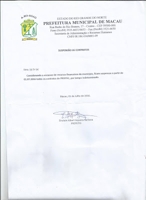 06 julho de 2016 MUNICÍPIO DE MACAU SUSPENDE CURSINHO DO PROITEC ALEGANDO FALTA DE RECURSOS FINANCEIROS.