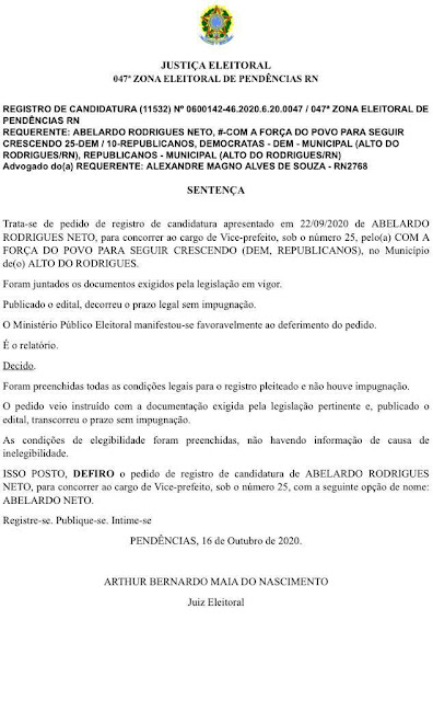 O registro das candidaturas foi deferido pelo juiz da 47º Zona Eleitoral na Comarca de Pendências. Nixon Baracho e Abelardo Neto concorrem à prefeitura de Alto do Rodrigues pela Coligação “Com a Força do Povo para Seguir Crescendo” (DEM-REPUBLICANOS).