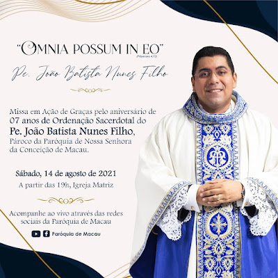 Neste sábado (14) dentro das festividades em honra a Nossa Senhora dos Navegantes, a paróquia de Macau rende graças ao bondoso Deus e a Virgem Mãe Senhora da Conceição e dos Navegantes pelos 7 anos de vida Sacerdotal do Padre João Batista (Pároco). A Santa Missa acontece a partir das 19h, na Igreja Matriz sendo transmitida pelas mídias sociais da paróquia.