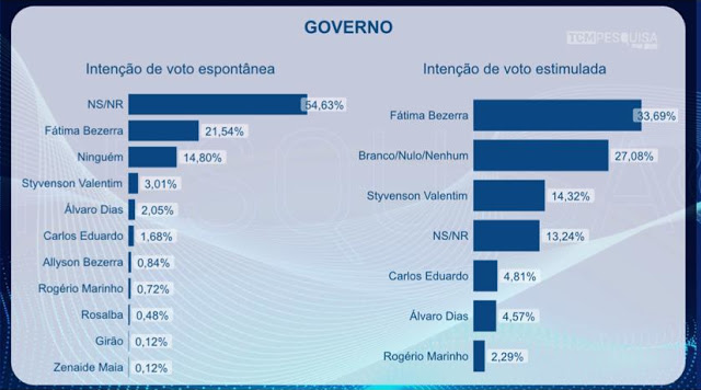 Na pesquisa estimulada, quando são apresentados os nomes dos candidatos, Fátima aparece com 33,69% contra 14,32% do senador Styvenson Valentim (Podemos), segundo nome mais citado. O ex-prefeito de Natal Carlos Eduardo (PDT) foi citado por 4,81% dos eleitores, tecnicamente empatado com o atual prefeito da capital Álvaro Dias (PSDB), com 4,57% das intenções de voto. O ministro do Desenvolvimento Regional Rogério Marinho (sem partido) foi lembrado por apenas 2,29%.