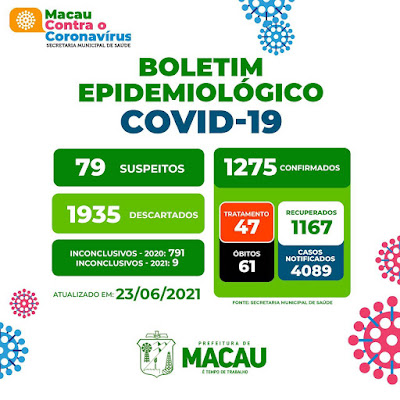 24 junho de 2021 PREFEITURA DE MACAU ATUALIZA BOLETIM COM OS NUMEROS DA PANDEMIA NO MUNICIPIO