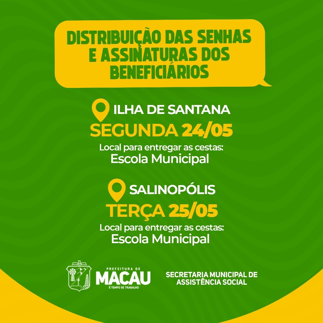 24 maio de 2021 PREFEITURA DE MACAU DIVULGA CRONOGRAMA DE ENTREGA DAS CESTAS BÁSICAS PARA OS DISTRITOS