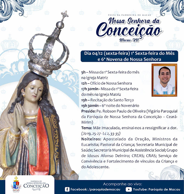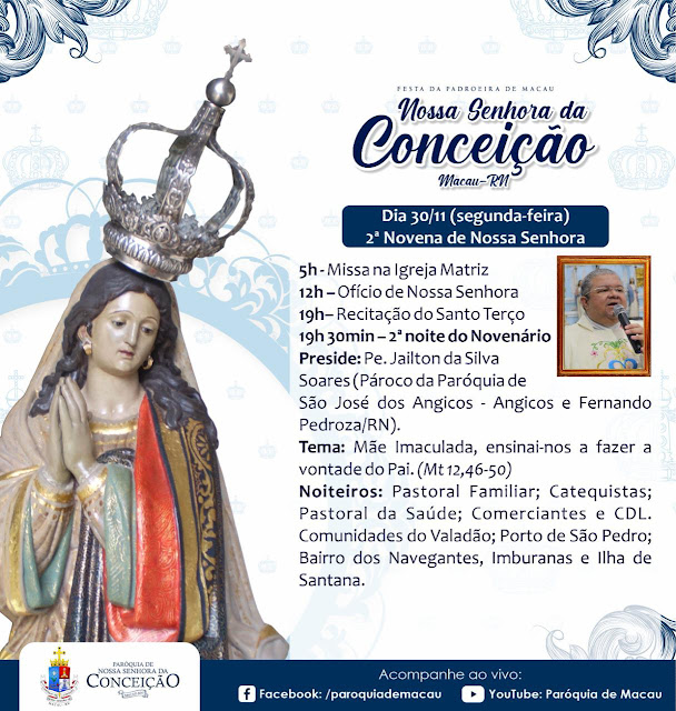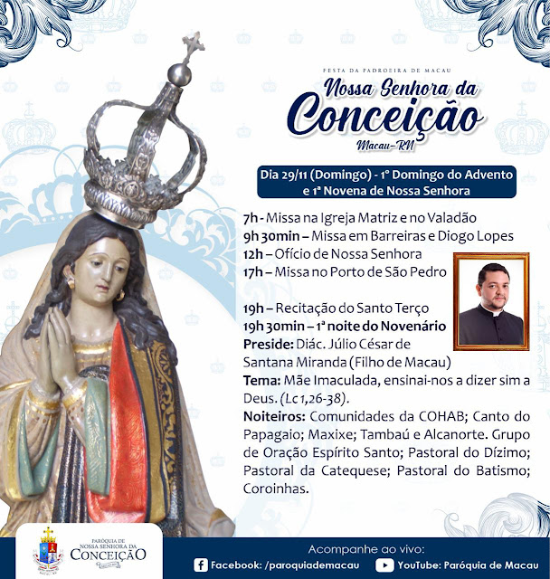 Já nos aproximamos da Festa de Nossa Padroeira. Ela será de maneira presencial, obedecendo todos os protocolos de segurança. Que nos motivemos para viver este momento forte, confiando as nossas preces à Nossa Senhora da Conceição de Macau, para que ela apresente as nossas súplicas a Jesus!