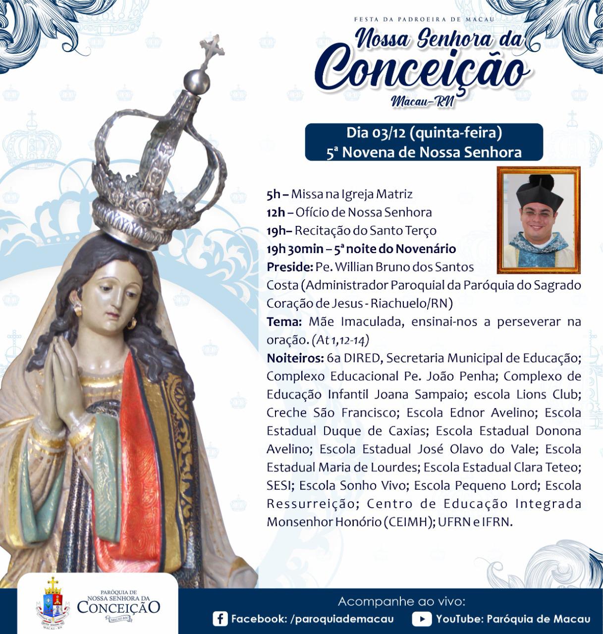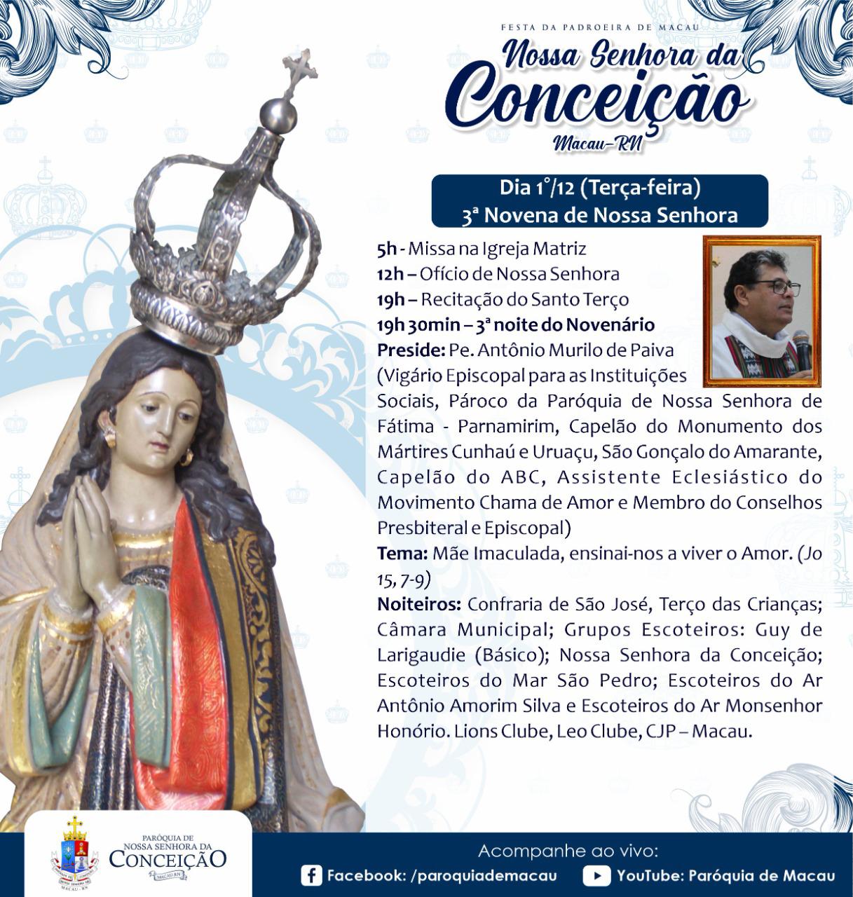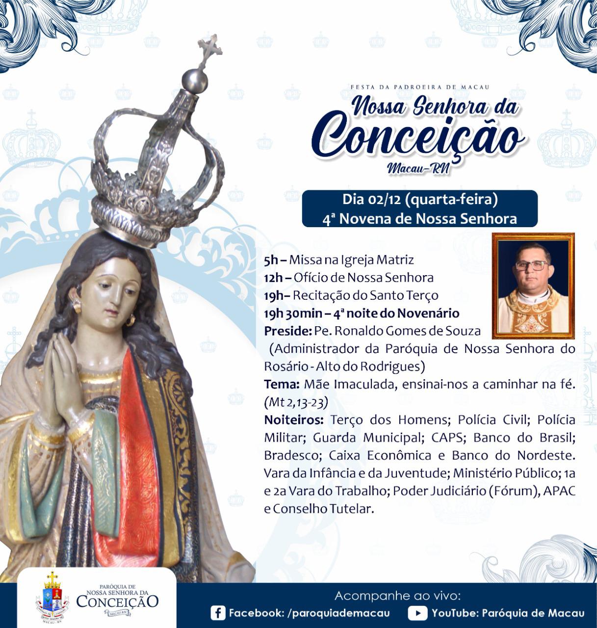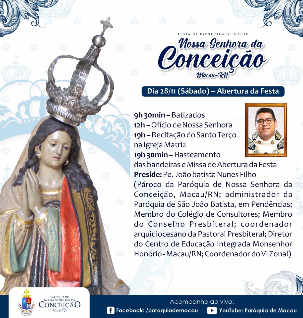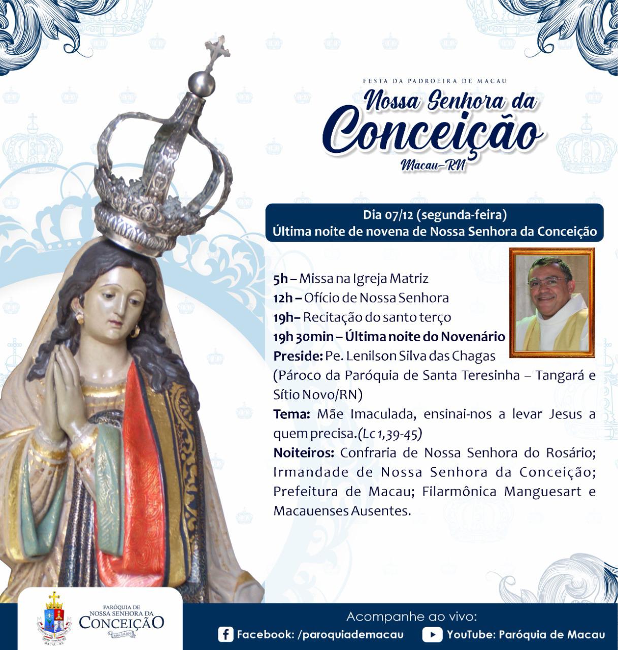 Já nos aproximamos da Festa de Nossa Padroeira. Ela será de maneira presencial, obedecendo todos os protocolos de segurança. Que nos motivemos para viver este momento forte, confiando as nossas preces à Nossa Senhora da Conceição de Macau, para que ela apresente as nossas súplicas a Jesus!