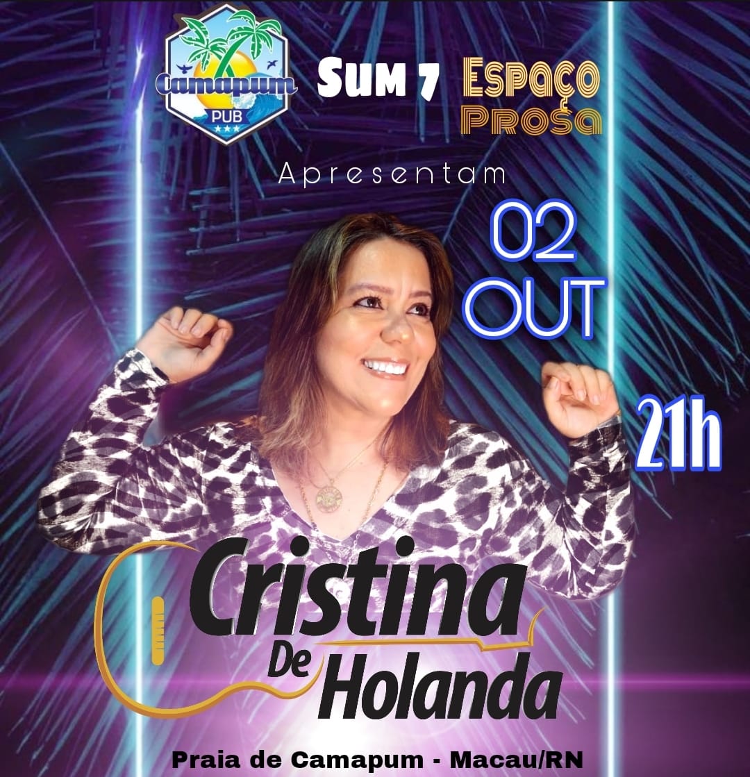 No próximo dia 02 de Outubro, na Praia de Camapum em Macau se apresenta a cantora Cristina De Holanda, vendas de senhas e mesa no Sun 7 na praia de camapum e com Joselito Braz.
